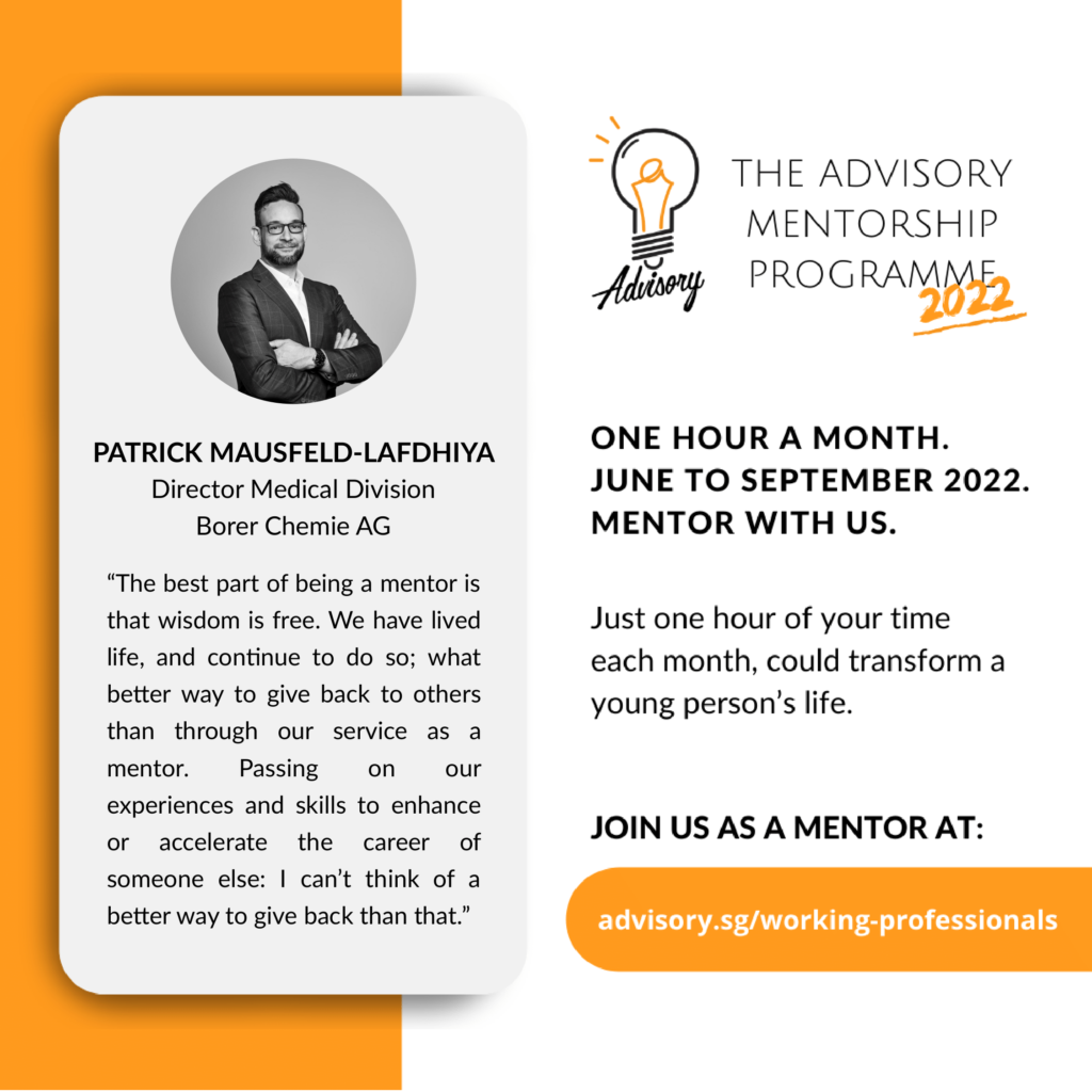 Da ich mich absolut mit der Vision von The Advisory, einer gemeinnützigen Organisation in Singapur, identifiziere „Eine Welt, in der junge Menschen in die Lage versetzt werden, fundierte Entscheidungen über ihre Zukunft zu treffen. Egal, wie alt du bist, egal, wo oder was du studierst“, habe ich 2022 an ihrem Mentorenprogramm teilgenommen. Von Juni bis Dezember hatte ich verschiedene Mentorsitzungen mit Yanesh S., einem Life Sciences Studenten, und ihm so dabei geholfen seine Stärken und Interessen besser zu verstehen und mögliche Karriereoptionen in der komplexen Medizinprodukte- und Pharmabranche zu reflektieren und ihm so deutlich tiefere Einblicke über sich und die Karriereoptionen zu ermöglichen.